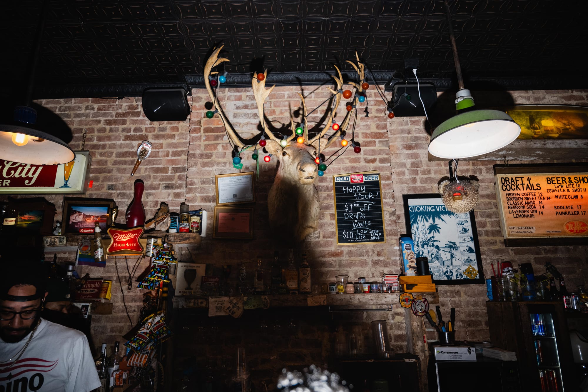 The eclectic decor of Turtles All the Way Down isn’t used to fighting for attention. Vintage beer signs, both sheet metal and aluminum, adorn the bar’s brick and wood slat walls, and the long bar is illuminated by the soft glow of overhead lamps. A mounted deer head looks on above the bar, Christmas lights tangled in its antlers. In the corner opposite the jukebox, beneath a hanging American flag and life-sized replica hammerhead shark, sits the bar’s crown jewel: an enormous turtle tank. The tank is home to the bar’s most famous regulars, two red-eared sliders named Ja Rule and Vita. Named after artists from Murder Inc. Records, the turtles laze in the tank most of the time, but on the first Sunday of each month, they can be seen on the other side of the glass. On a shuffleboard table in the front of the bar, they spend their Sunday evening racing one another down a short, green, carpeted track.